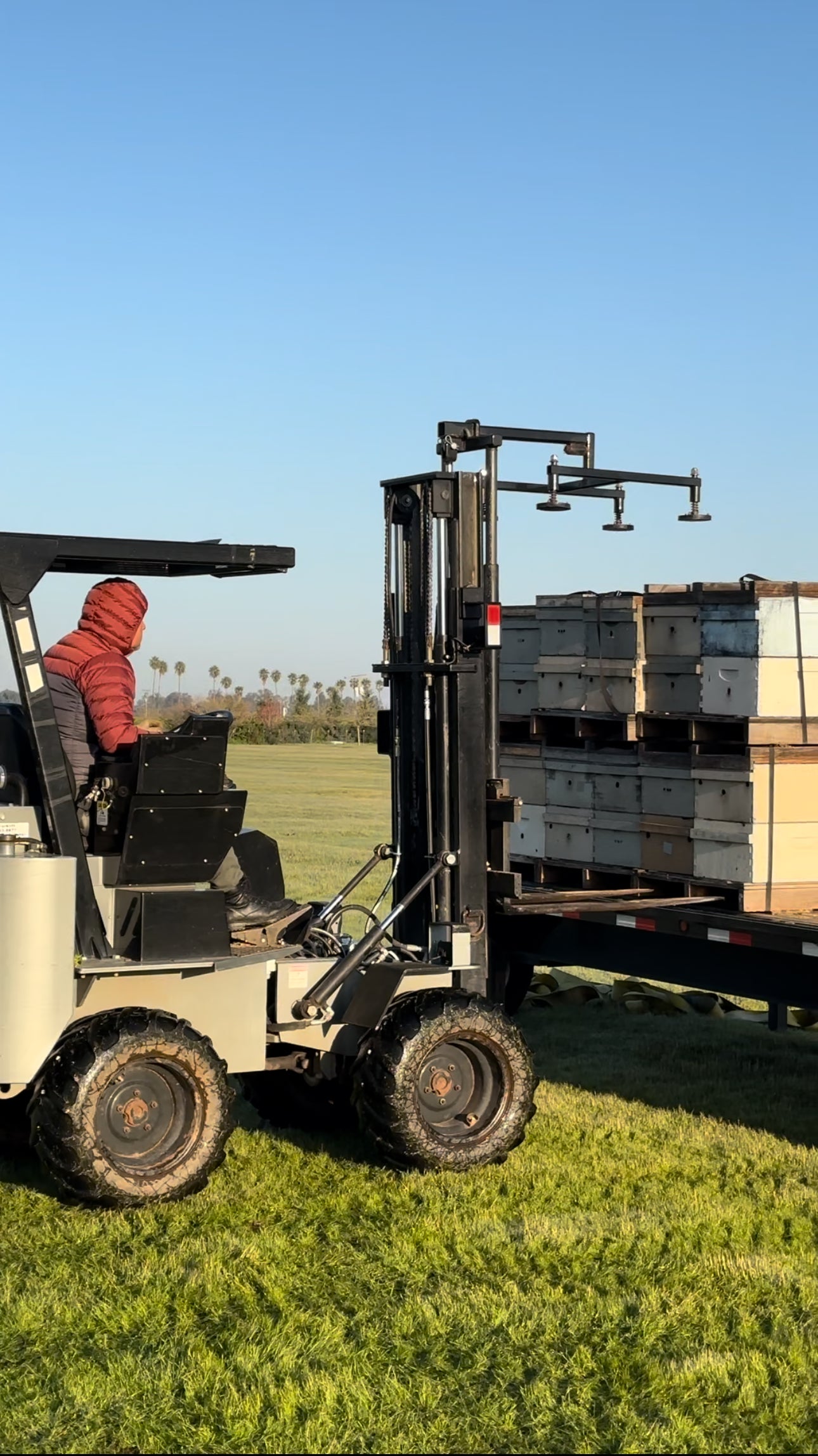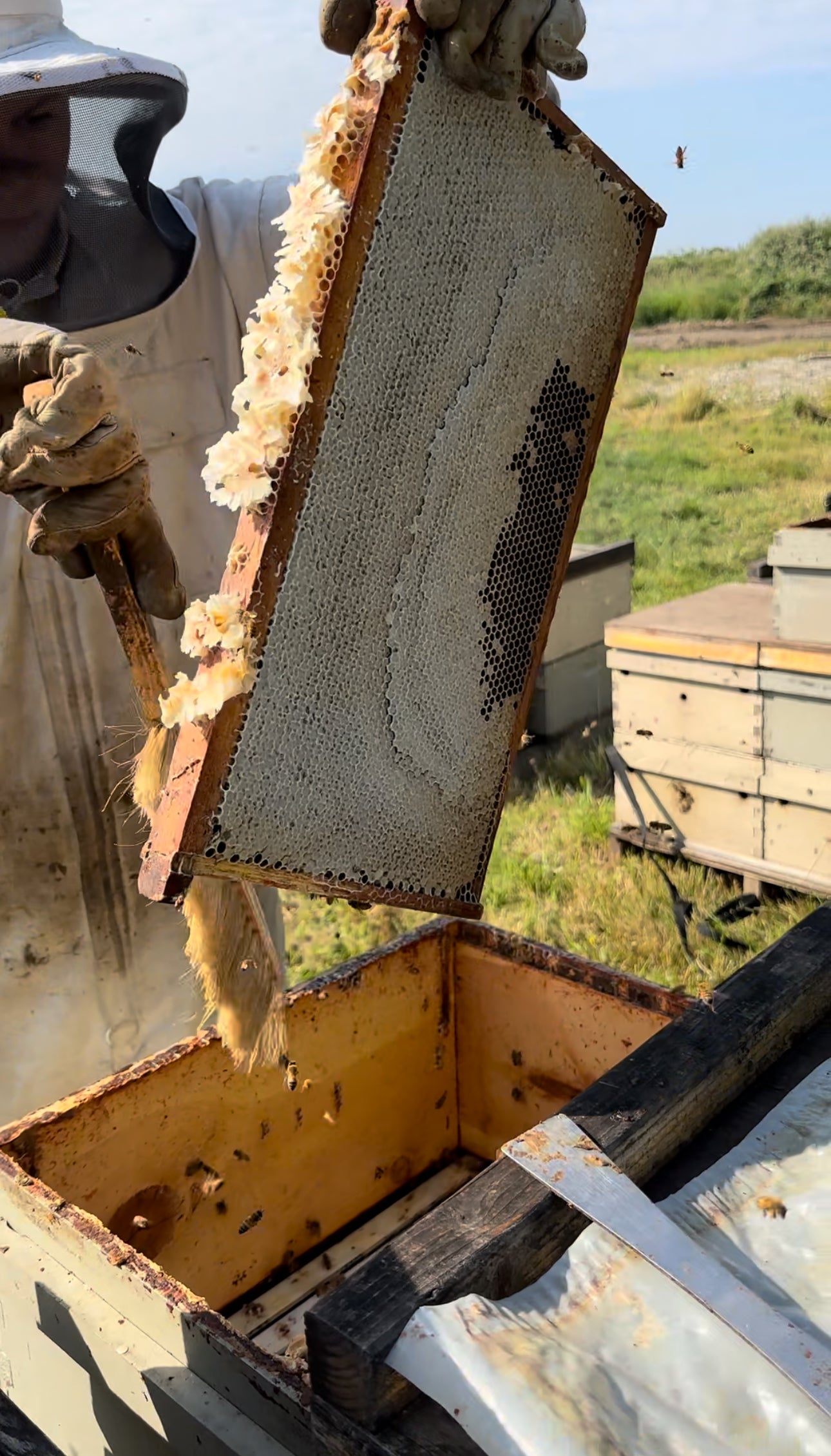 Now that the bees have filled up and closed off the cells. It's time for harvest. So grab your scraper, brush, and a smoker and here we go! Brush off the bees, fill the empty hive with honey frames, stack the pallets and off we go to our warehouse for extraction.