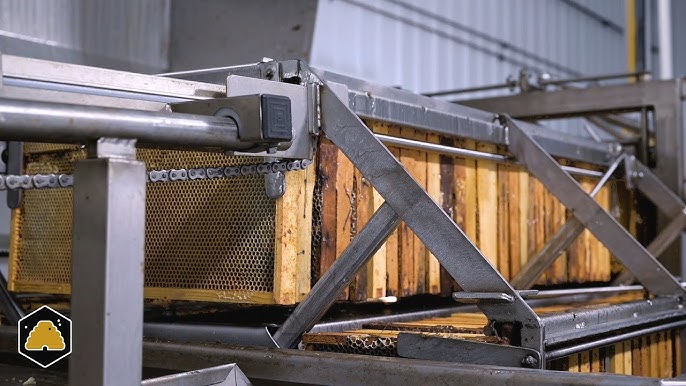 Now that weve got our honey hives without bees in the warehouse. It's time to extract. We use a 60 frame extraction line from Cowen that cuts the comb that the bees used to seal off thew honey sells, moves the frames into the extraction machine, the machine spins so fast the honey shoots out of the cells and flows through the auger system right into our steel drums. it then pushes out the frames and we collect them into boxes and stack them onto a pallet, keeping us from any contact with honey.